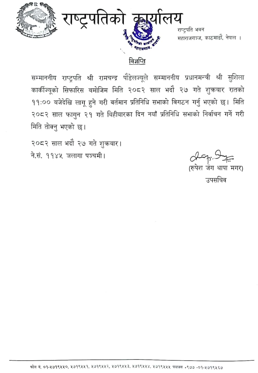 काठमाडौँ । राष्ट्रपति रामचन्द्र पौडेलले प्रतिनिधिसभा विघटन गर्ने निर्णय गरेका छन् । नवनियुक्त प्रधानमन्त्री सुशीला कार्कीको सिफारिसका आधारमा राष्ट्रपति पौडेलले प्रतिनिधिसभा विघटन गर्ने निर्णय गरेका हुन् ।